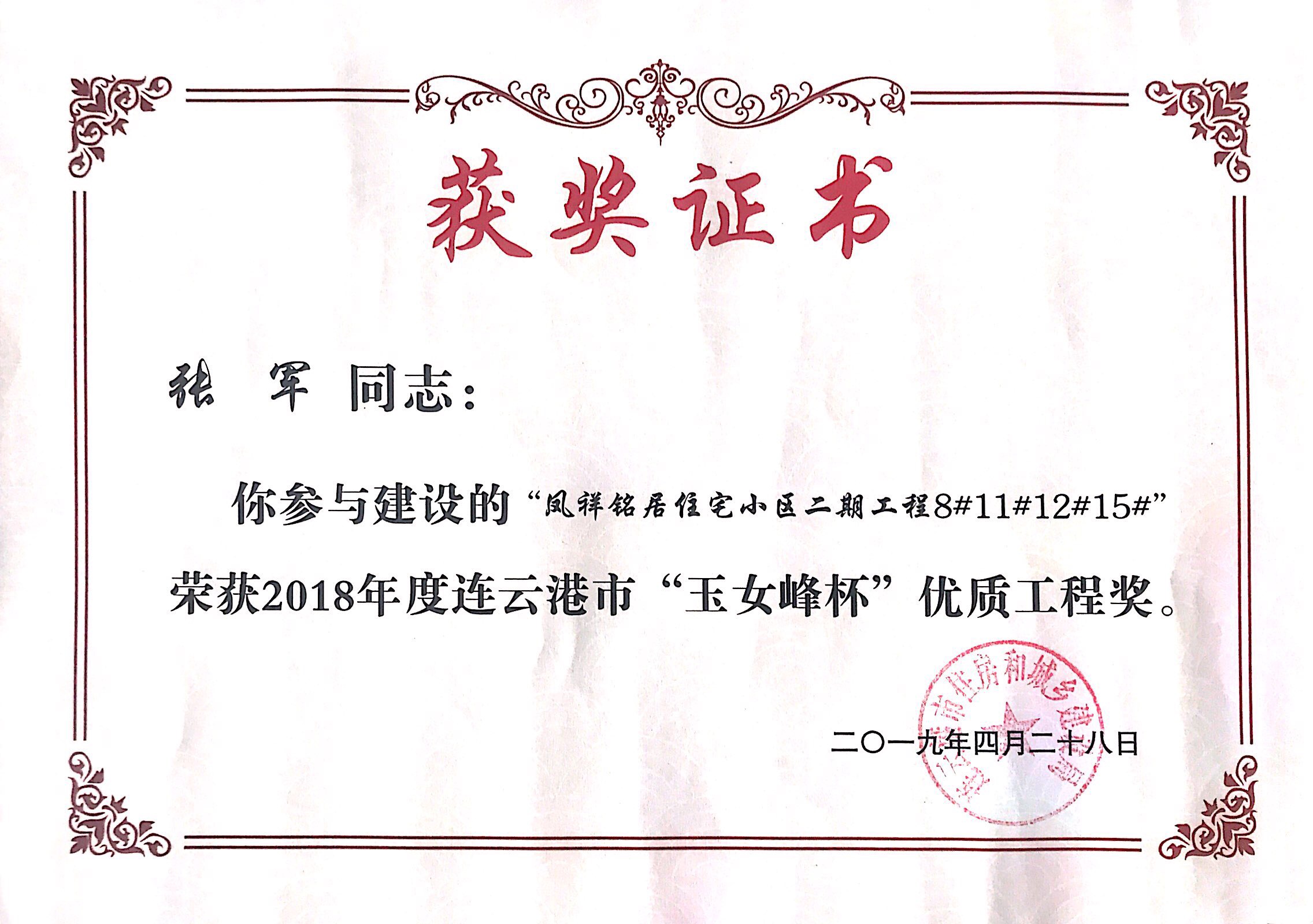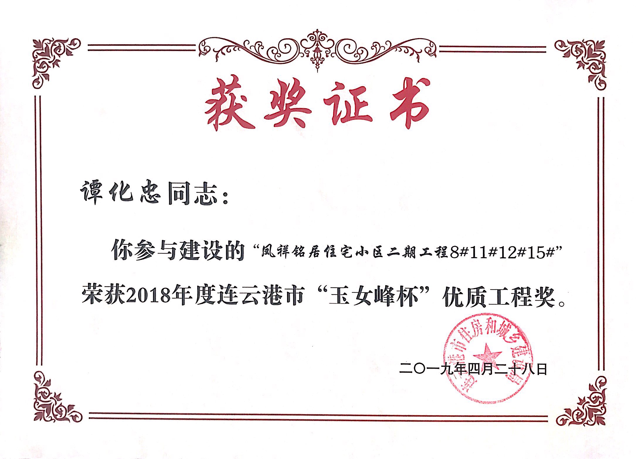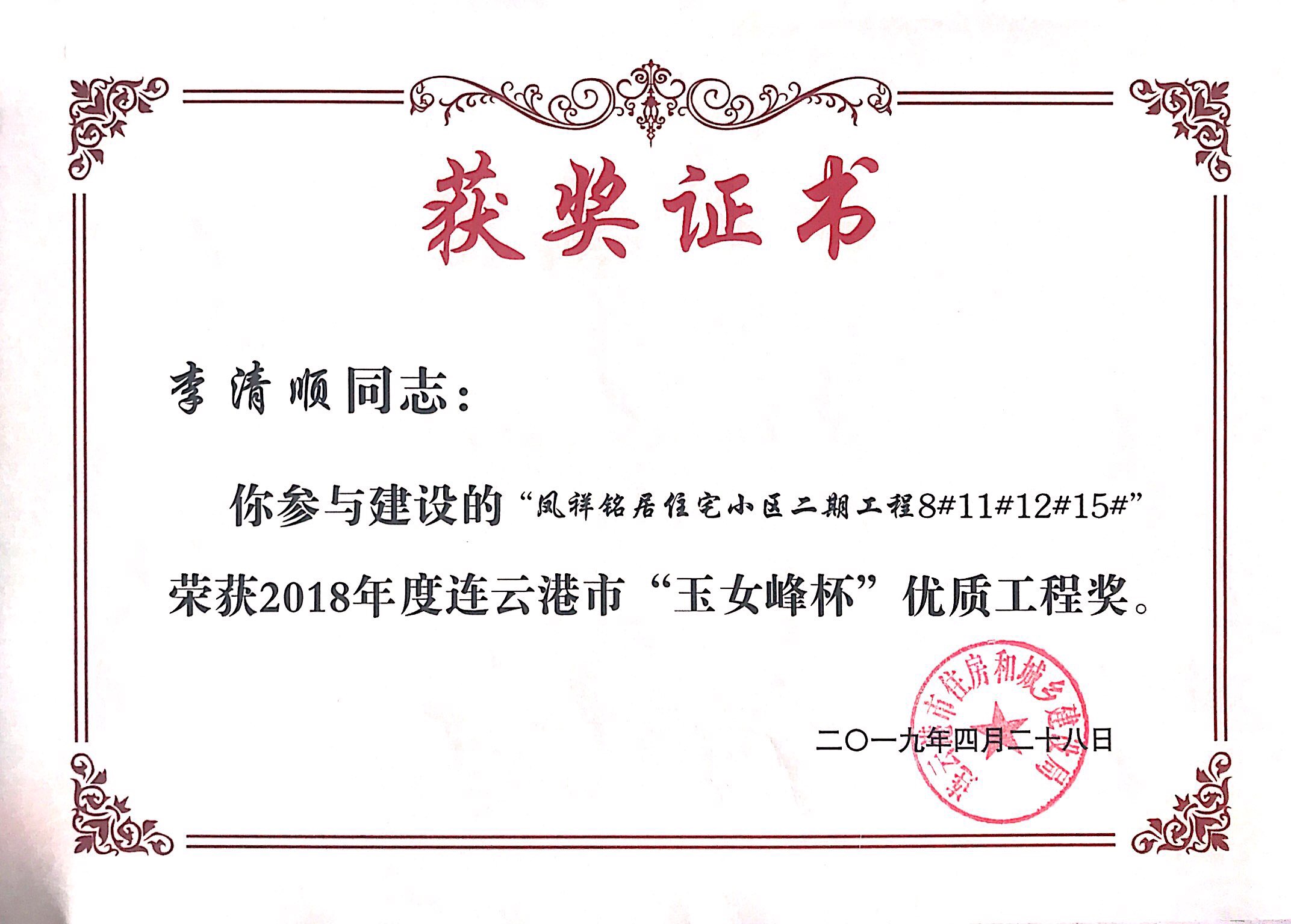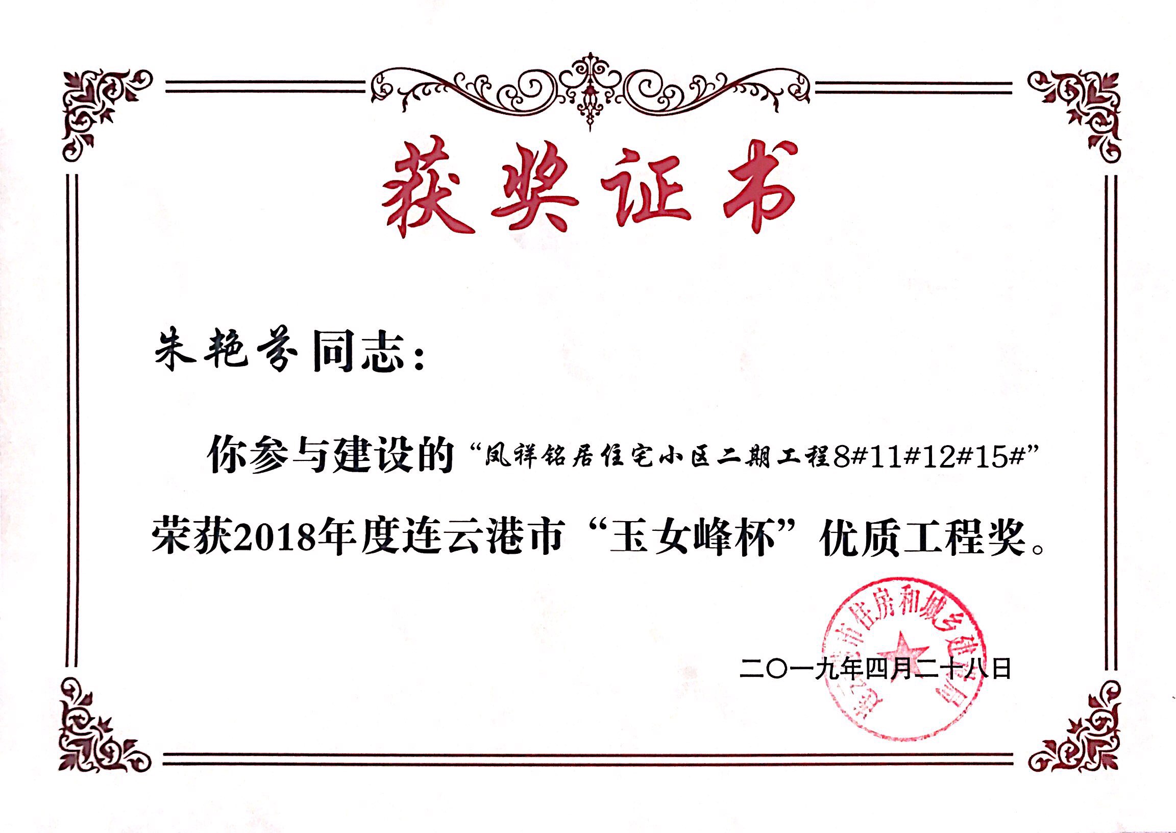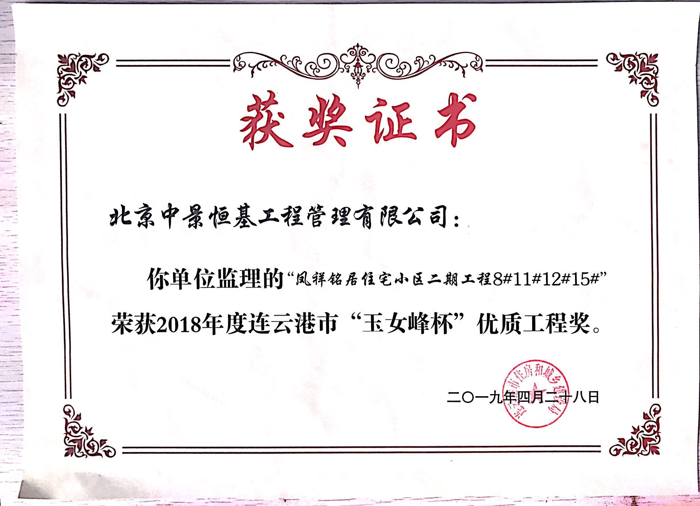 近日,凤祥铭居小区再次荣获连云港市玉女峰杯优质工程奖。玉女峰杯系连云港建筑施工领域工程质量最高奖项,此前,该项目已多次获得省级、市级行业主管部门表彰。现已顺利完成整体交付工作。